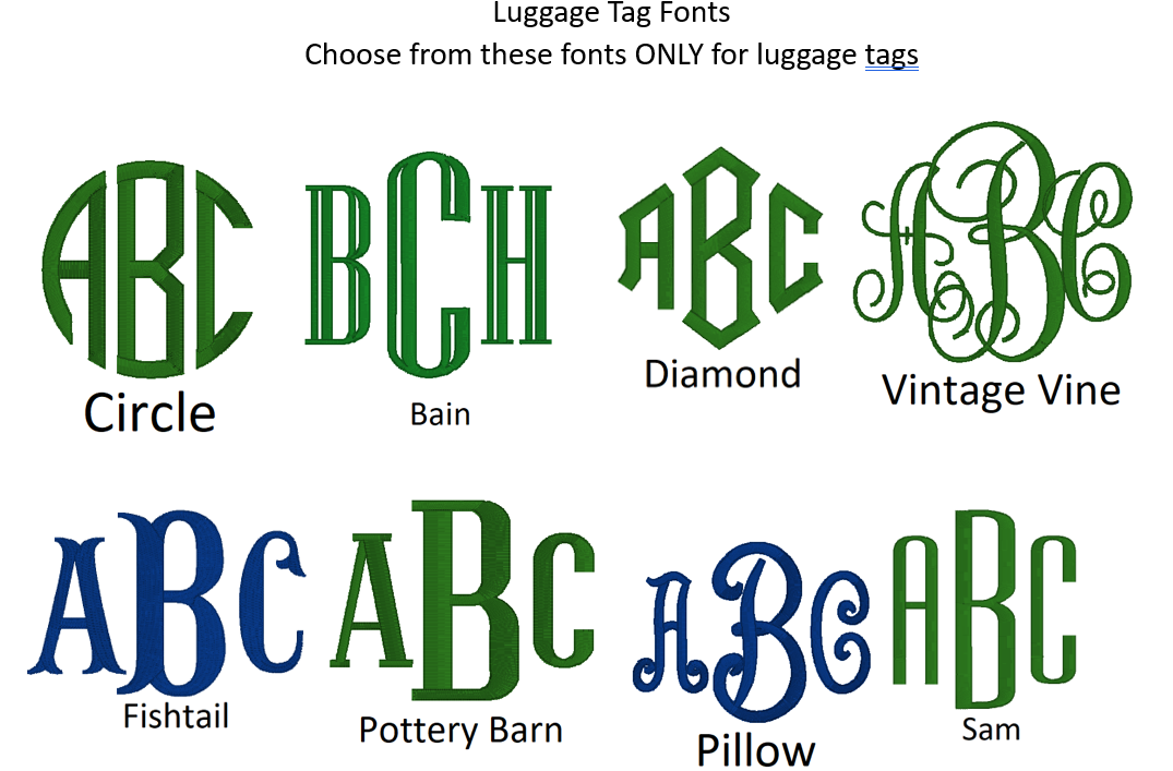 Monogram with single initial or 3 letter monogram. For a 3 letter monogram, there are only a few font styles that show up well on the luggage tag. Please choose from font choices in the listing pictures. You can also choose a single initial instead of a 3 letter monogram.