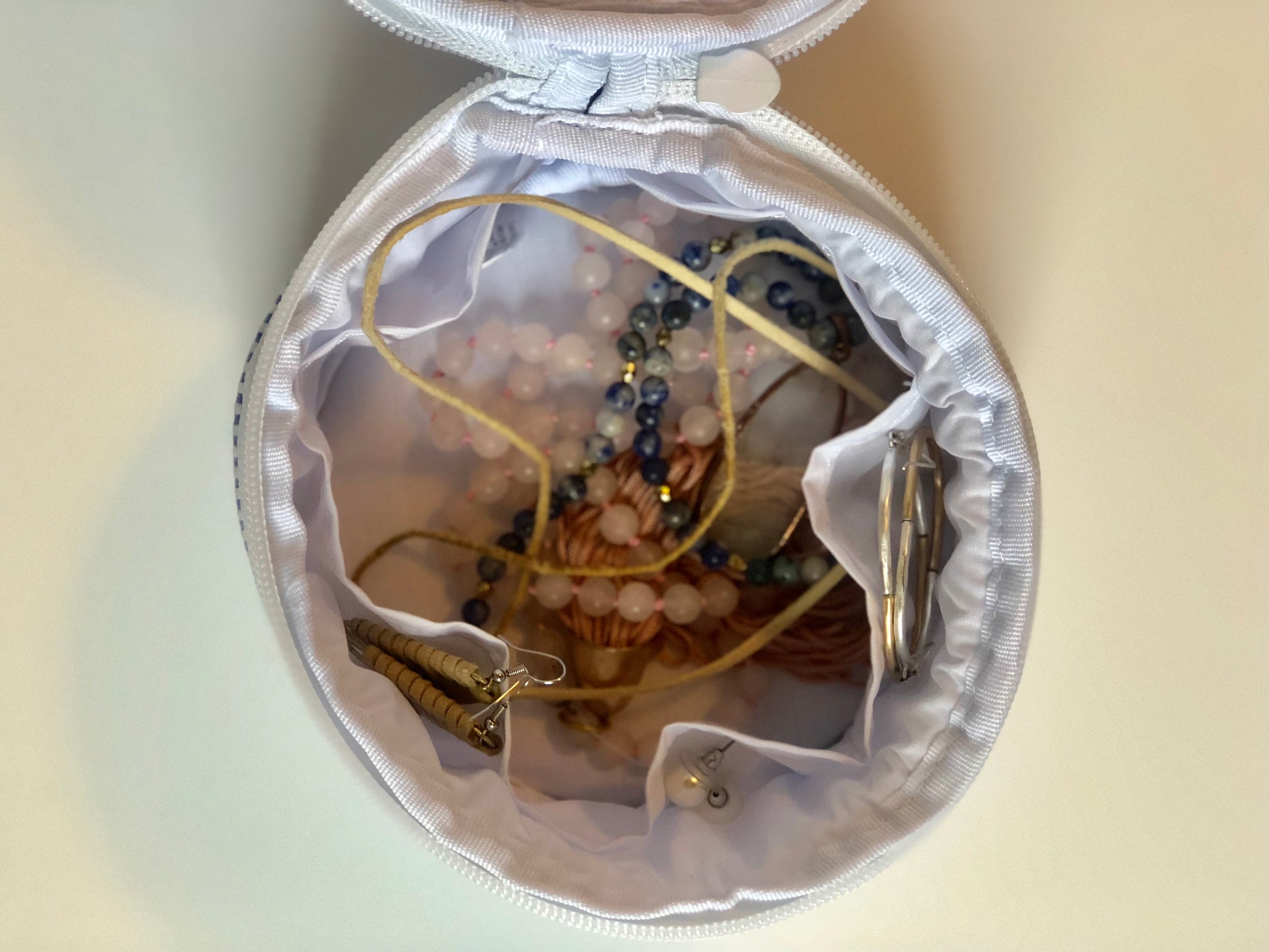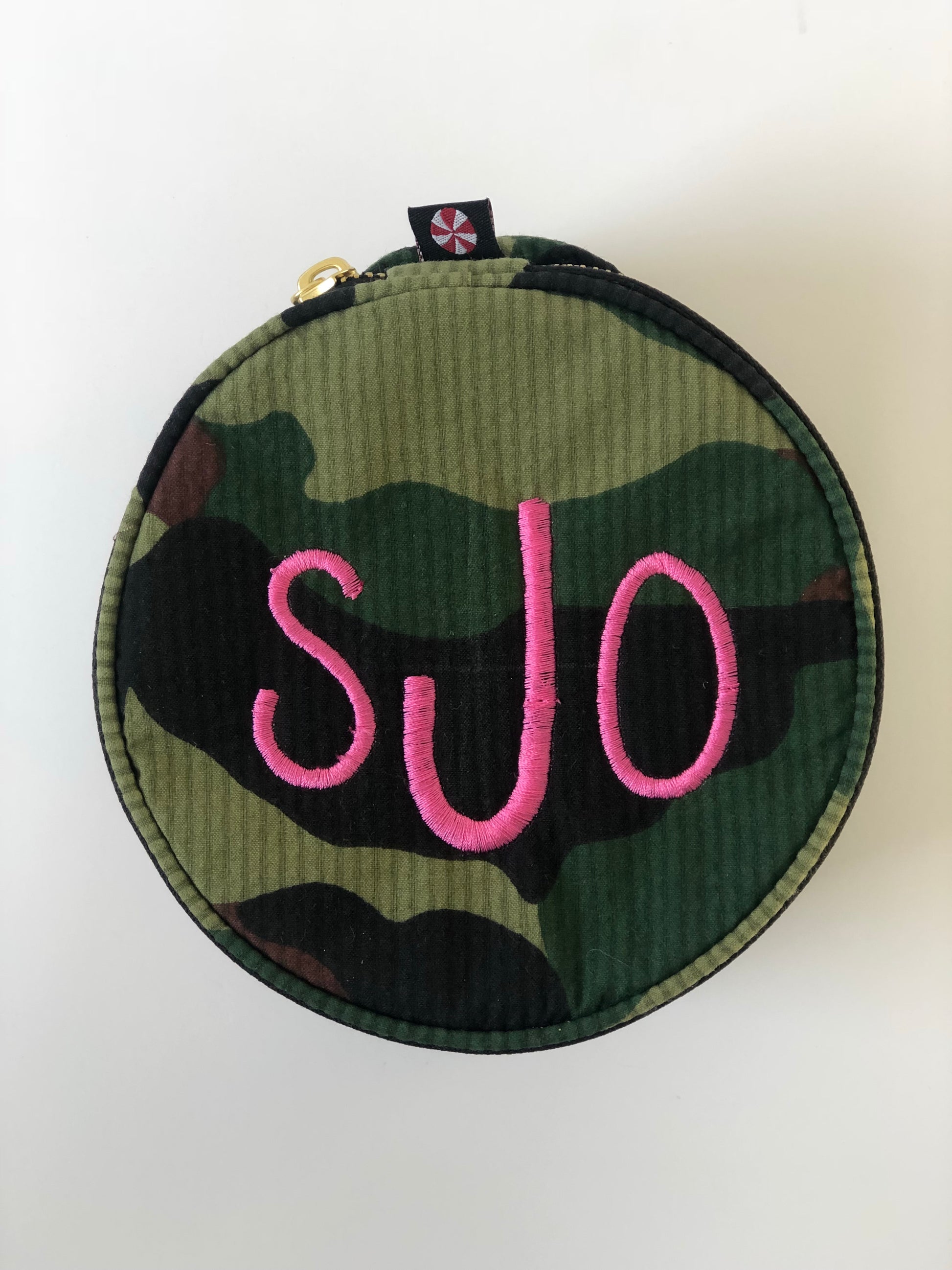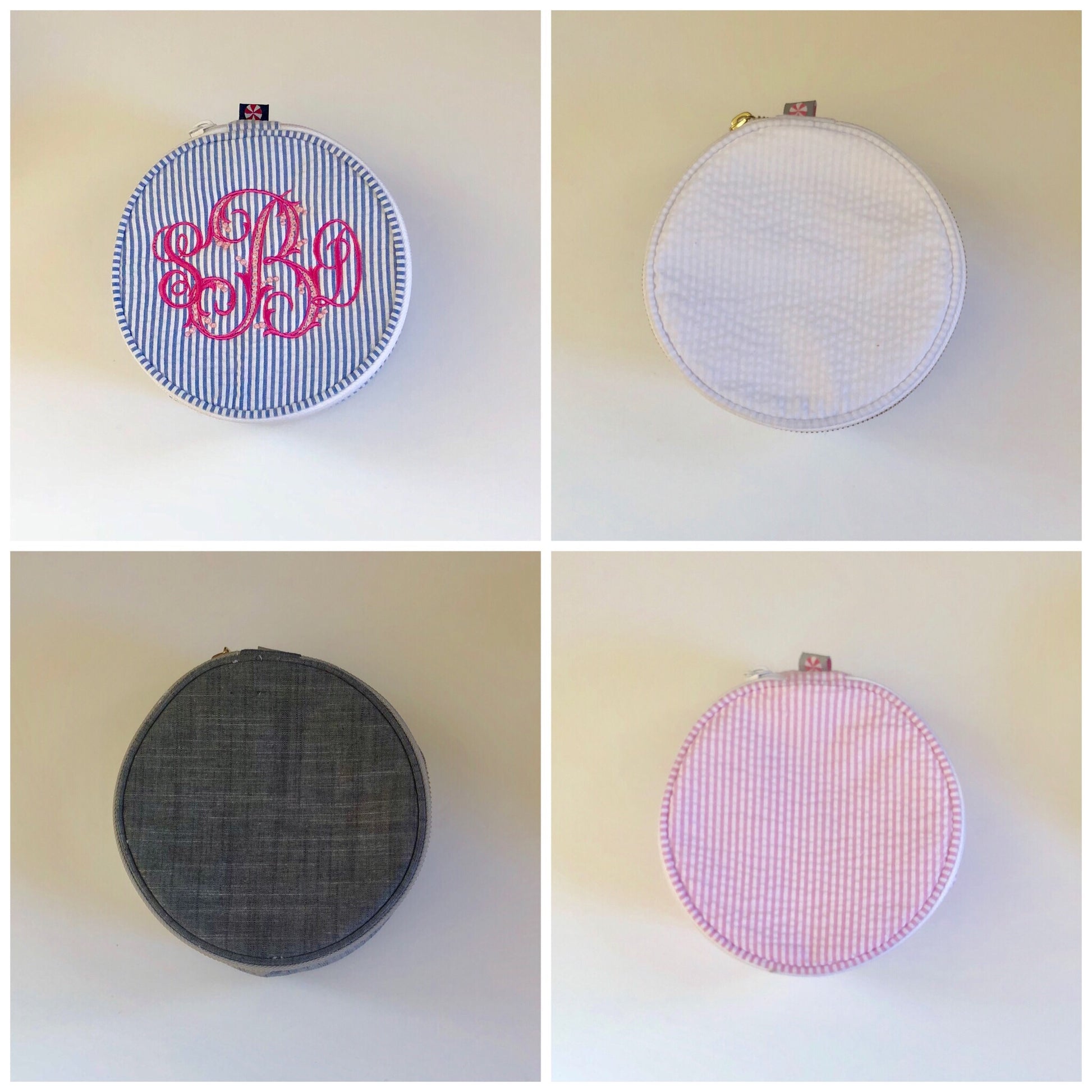This 6” zippered pouch is perfect for storing jewelry, and for travel. With pockets lining the sides for earrings, and plenty of room in the center for necklaces and bracelets. Monogram with name or 3 letter initials.